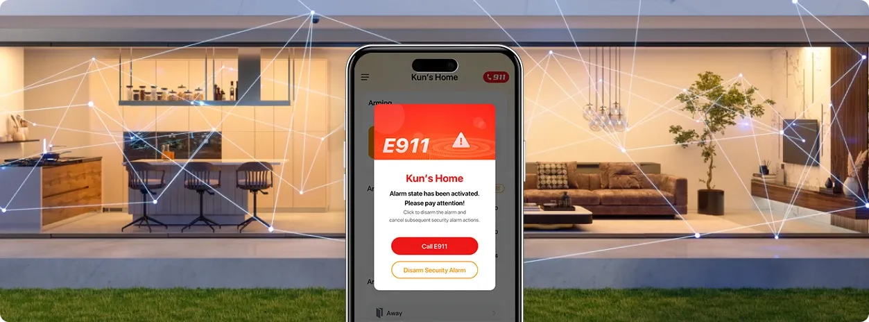 点击安防App内的 E911键,即可将您在App内绑定的家庭地址发送至911接线员,让帮助来得更快。