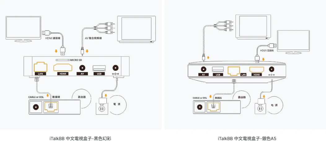 > 使用傳統電視:若您的電視機沒有HDMI端口,請將AV復合視頻線兩端的三個插頭按顏色插入電視機及機頂盒的AV端口。