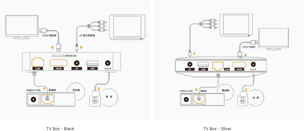 > Using a traditional TV: If your TV does not have an HDMI port, insert the three plugs at each end of the AV composite video cable into the AV port with the same color as the plug on the TV and the TV box.