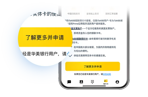 iTalkBB 是一家通讯公司,而非银行。银行产品及其服务由华美银行(Member FDIC)提供。作为 Prime App 客户,您还可以申请我们独家的 iTalkBB 银联预付卡套餐,这是由华美银行(Member FDIC)提供的虚拟银联预付卡和美国支票账户,无需开户费。3, 4 了解更多 。一个App就能处理国内通讯及支付,无3%外卡交易手续费。4, 5, 6