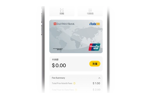 5.使用iTalkBB银联预付卡进行购物之前需事先存入美元资金。iTalkBB银联预付卡只能从符合资格的华美银行支票账户圈存/重新圈存资金。您必须注册华美银行网上银行服务来使用这一功能。适用其它条款、条件和收费。了解更多。
