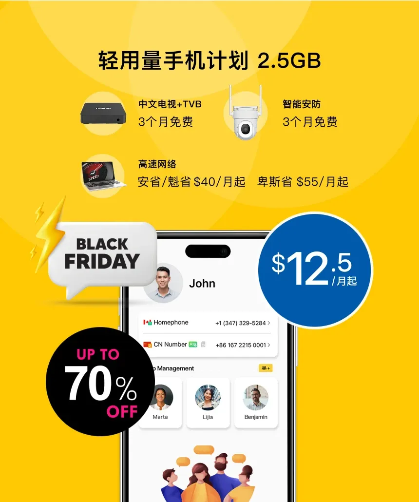 2.iTalkBB Prime APP:包含1个加拿大号码,另可选择1个免费美国、香港或中国号码。首3月$0/月,之后$8.99/月,另设$1.99/月管理杂费,合约期18个月。