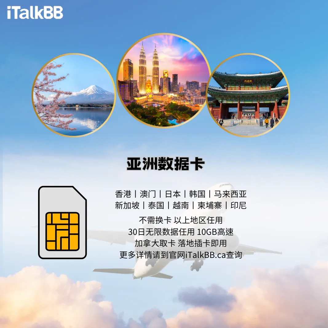 在加拿大取卡落地即用,一卡即享30日无限数据,10GB高速,可以在香港、澳门、日本、韩国、马来西亚、新加坡、泰国、越南、柬埔寨、印尼十个国家或地区使用,方便抵用!如果回亚洲会去多过一个国家或地区,本数据卡就更是为你度身订造!一键了解详情:https://www.italkbb.ca/chs/DataK