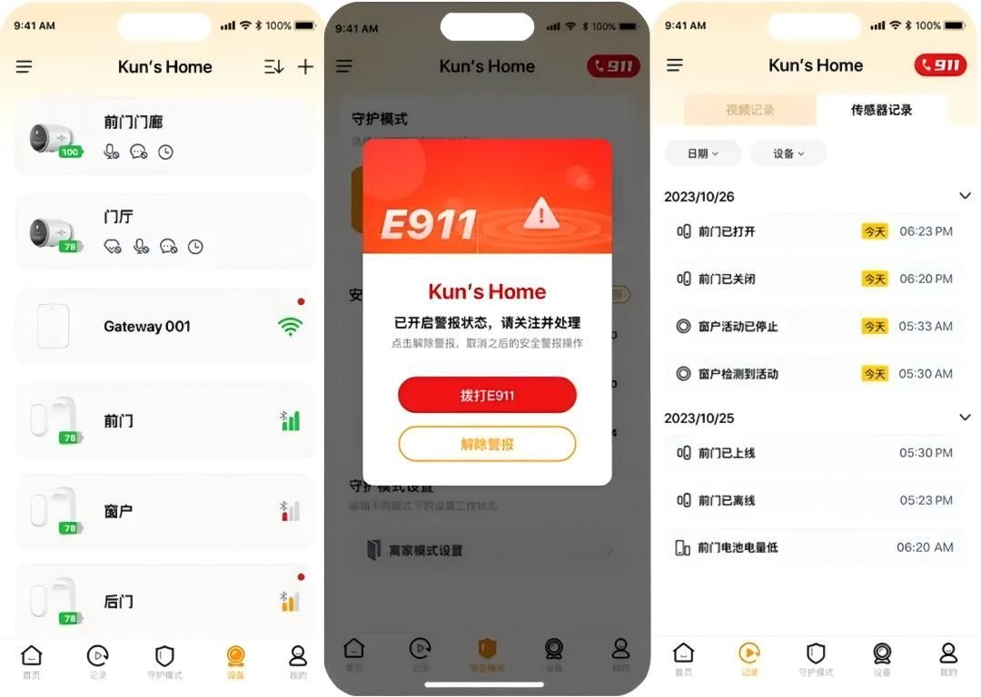 ✅ 手机App推送通知,可查看系统触发记录,E911全球一键携地址报警:
